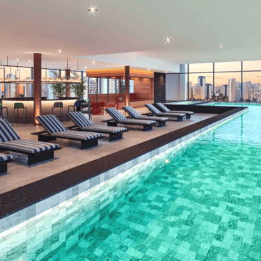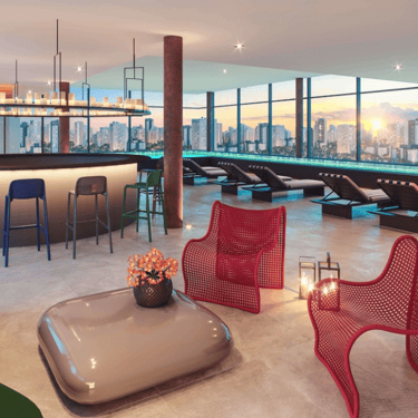 As áreas compartilhadas elevam o cotidiano a outro nível, com coworking, lounges, lavanderia, rooftop completo com piscina de raia, spa, sauna, fitness e vista panorâmica — trazendo a sensação de viver em um hotel, todos os dias, a poucos passos de casa.