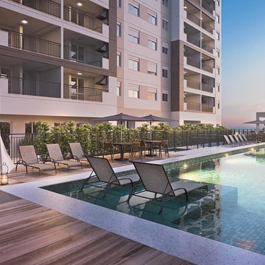 O lazer é completo e bem distribuído, atendendo todas as idades: piscinas adulto e infantil com deck molhado, solarium, academia ampla, salão de festas com terraço, churrasqueira, brinquedoteca, playground e espaço de jogos. Ambientes entregues equipados e decorados para transformar o cotidiano em momentos de convivência e relaxamento.