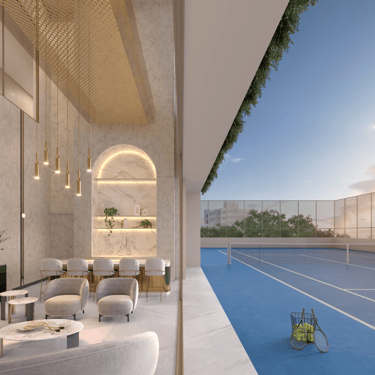 A arquitetura contemporânea valoriza linhas marcantes, integração visual e amplos vãos, enquanto o paisagismo cria cenários que transformam o cotidiano em contemplação. O lazer é distribuído em pavimentos elevados, garantindo privacidade e vistas privilegiadas: piscina descoberta e coberta, pool house, private house, quadra de tênis, lounge tênis, fitness com terraço, sauna, brinquedoteca, playground, secret space e espaços dedicados ao home office.