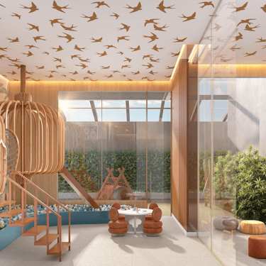 Ambientes dedicados às famílias, como brinquedoteca e playground